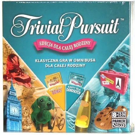 Trivial Pursuit : edycja dla całej rodziny. - Warszawa : Hasbro Poland Sp. z o.o., [2019]. - 1 pudełko (plansza, 400 kart, 2 pojemniki na karty, 6 pionków, 36 kolorowych trójkącików, kostka do gry) : karton, plastik, kolor ; w pudełku 27x27x6 cm + instrukcja ([2] strony : ilustracje ; 26 cm).
