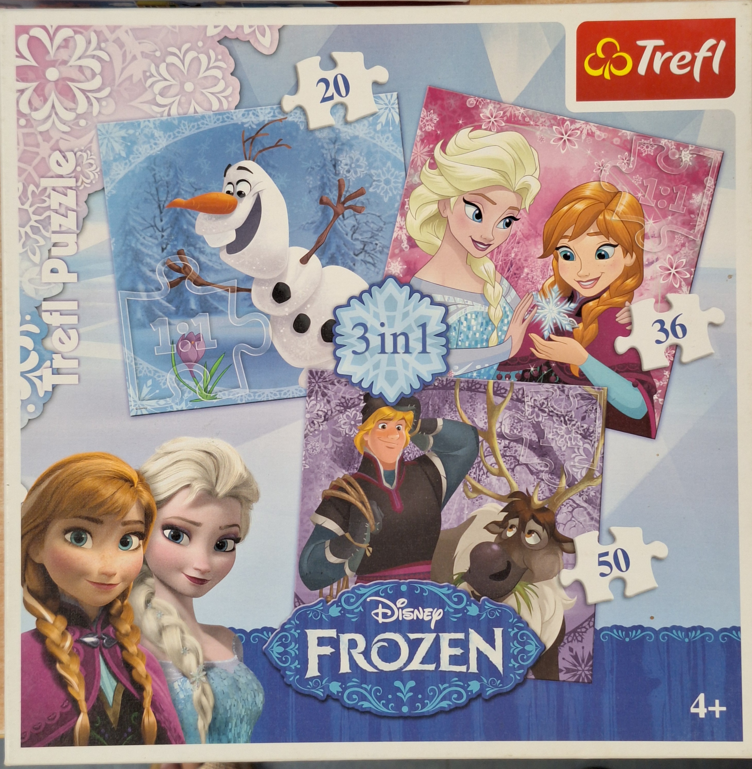 [Kraina Lodu : magiczna opowieść]. - Gdynia : TREFL SA, [2020]. - 3 układanki (20+36+50 puzzli) : tektura kolorowa ; w pudełku 28x28x6 cm.