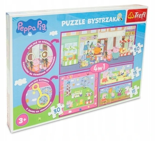 Puzzle bystrzaka : Peppa Pig. - Gdynia : TREFL SA, [2015]. - 4 układanki (110 elementów) : tektura kolorowa ; w pudełku 23x35x4 cm.