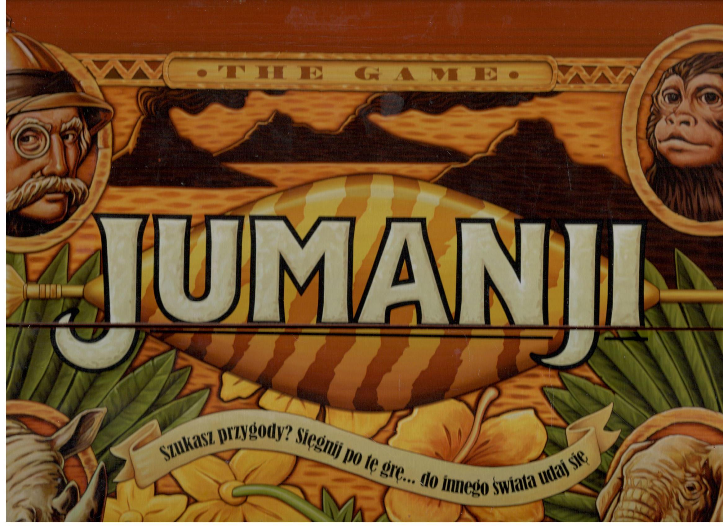 Jumanji. - Wersja drewniana. - [Warszawa] : Spin Master, © 2020. - 1 pudełko (1 plansza, 4 drewniane pionki, 1 figurka nosorożca, 1 klepsydra z piaskiem, 1 kostka z cyframi, 4 kostki ratunkowe, 30 kart niebezpieczeństwa, 1 dekoder kart, 1 arkusz do oznaczania, instrukcja) ; 38x29x6 cm.